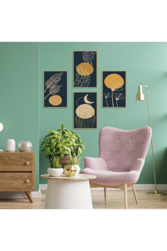 Modern Yaprak Tasarımlı %100 Mdf Dekoratif Duvar Tablo Seti 4 Parça